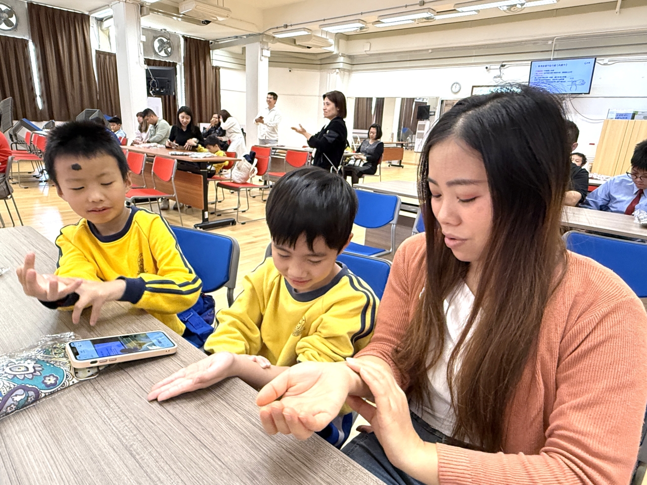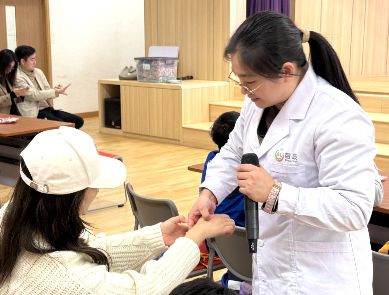 醫師細心講解常用保健穴位,家長與孩子互相練習按壓。雖然按到痠痛處時「哎呀」聲此起彼落,但親子間互相合作找準穴位的情景,卻讓健康知識在笑聲中自然傳遞,場面溫馨。