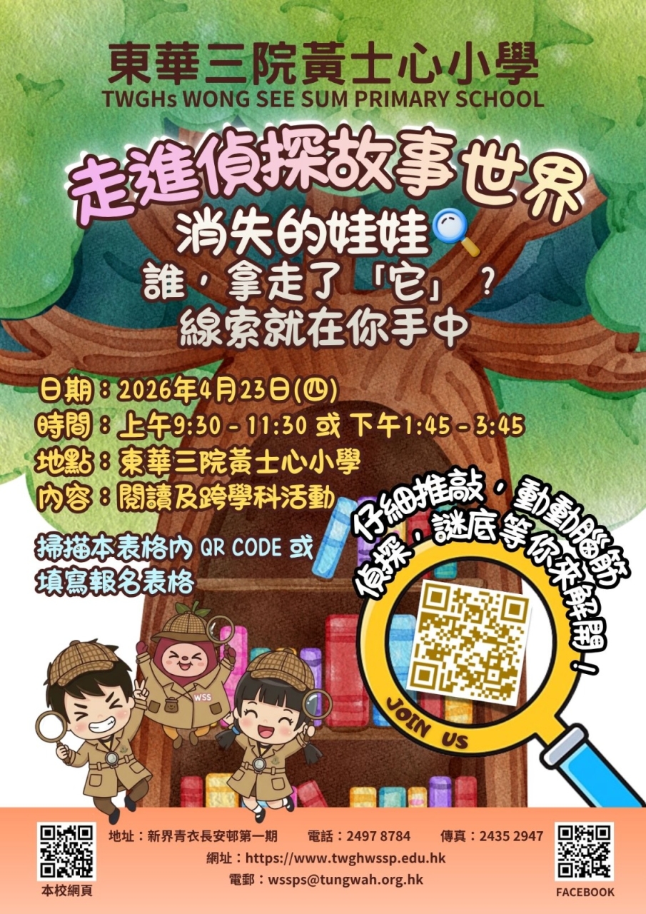 東華三院黃士心小學 誠邀各位幼稚園小朋友及家長,一齊走進偵探故事世界,解開 《消失的娃娃》 之謎!📖🔍