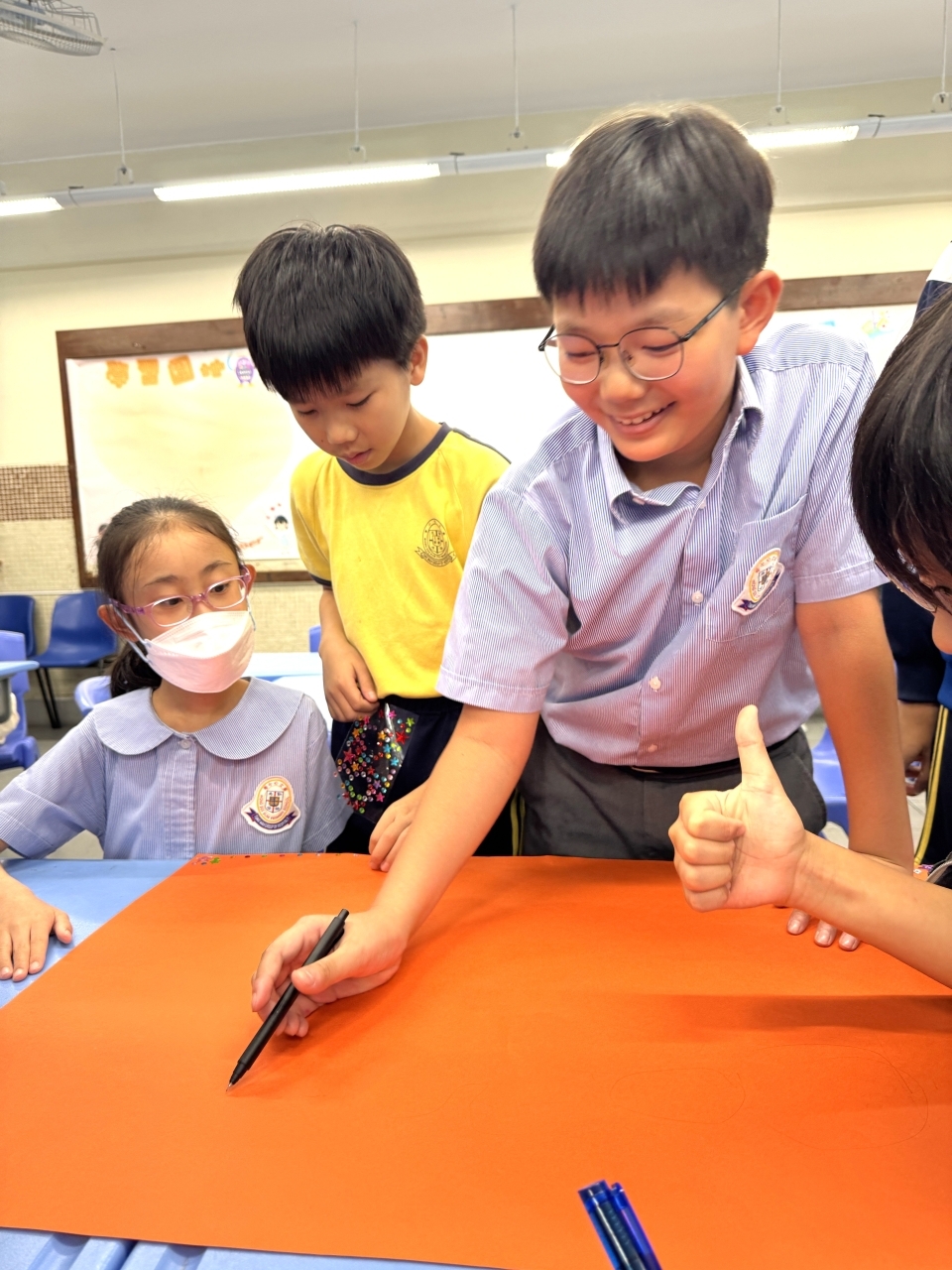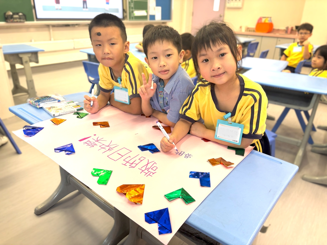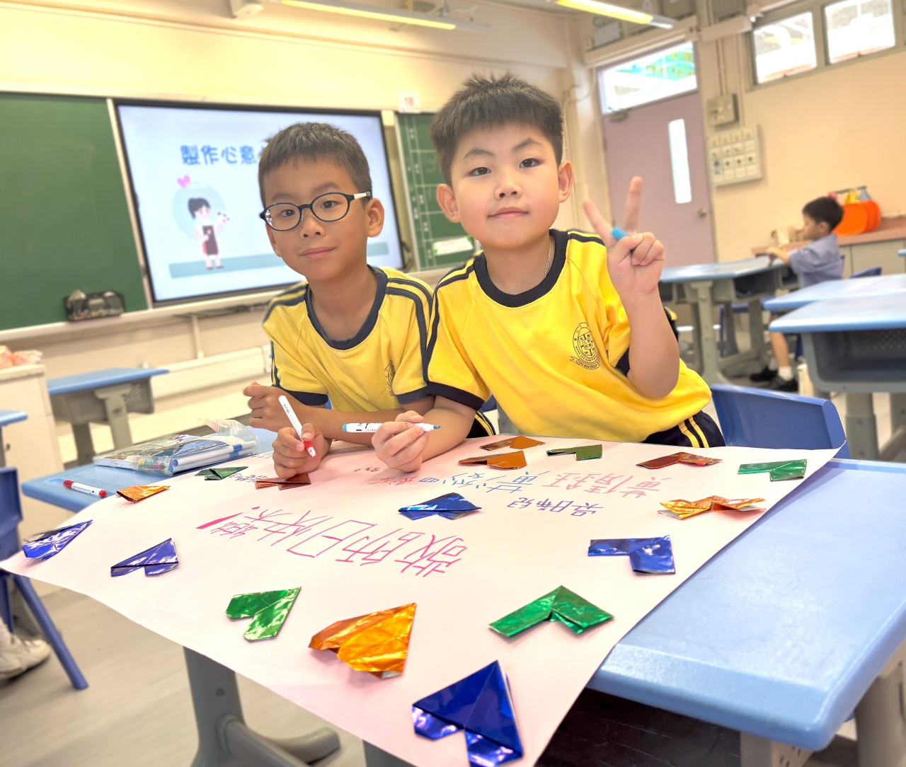 低年級的同學認真合作,高年級的學長發揮創意與團結力量,一起設計了獨一無二的心意卡和感謝信