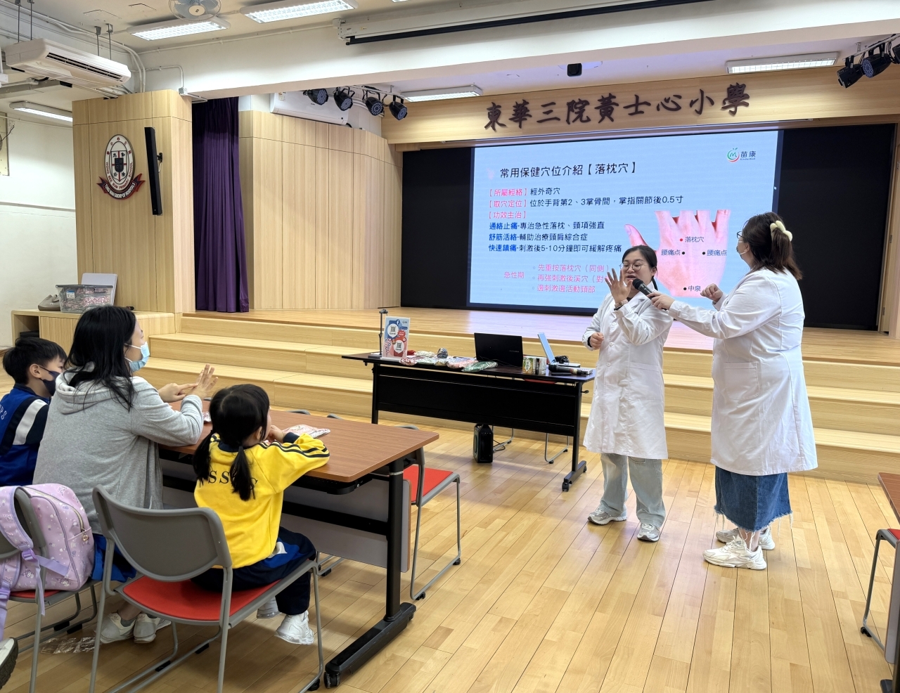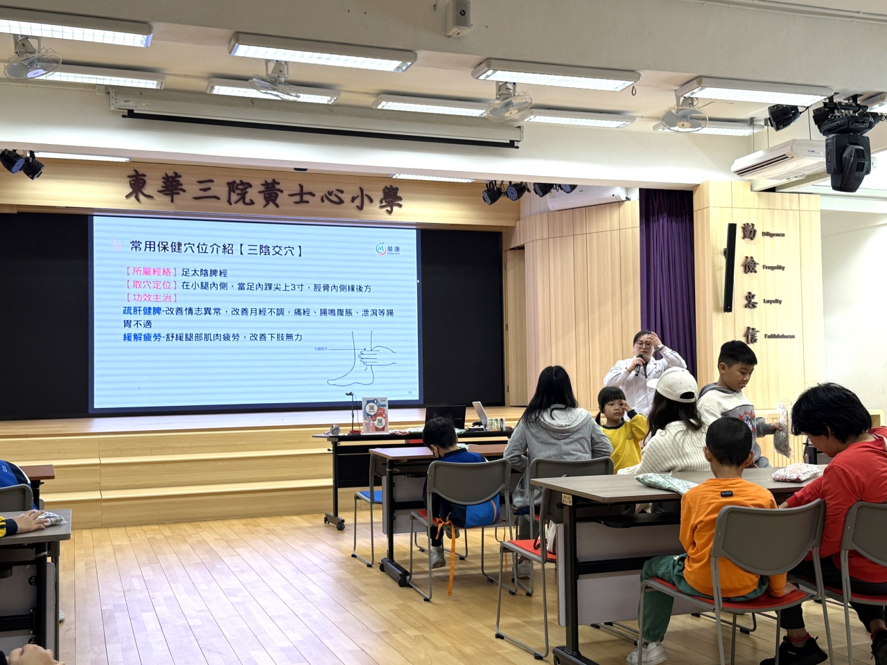 醫師細心講解常用保健穴位,家長與孩子互相練習按壓。雖然按到痠痛處時「哎呀」聲此起彼落,但親子間互相合作找準穴位的情景,卻讓健康知識在笑聲中自然傳遞,場面溫馨。