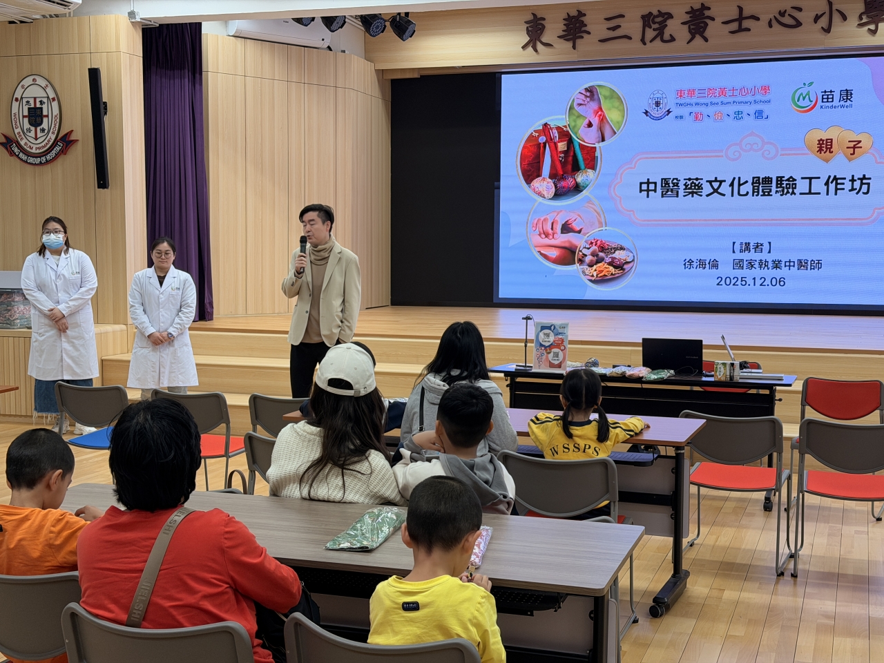 學校舉辦「中醫藥文化親子工作坊」,特邀「苗康中醫生活體驗館」專業團隊到校,以生動互動形式,帶領多個家庭深入體驗中醫養生智慧。從穴位保健到湯膳食療,從八段錦舒展到艾草手作,洋溢溫馨歡樂的學習氣氛,更促進了親子間的親密互動與跨代對話。