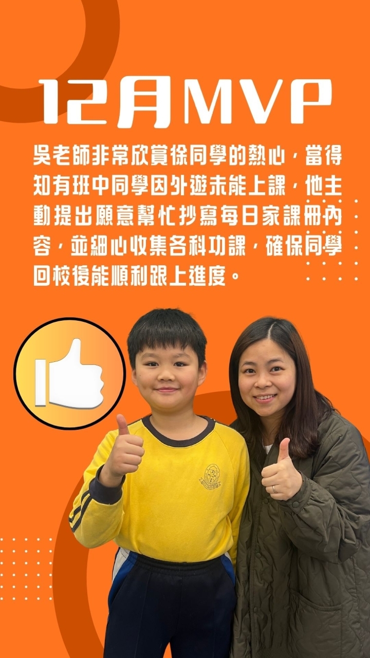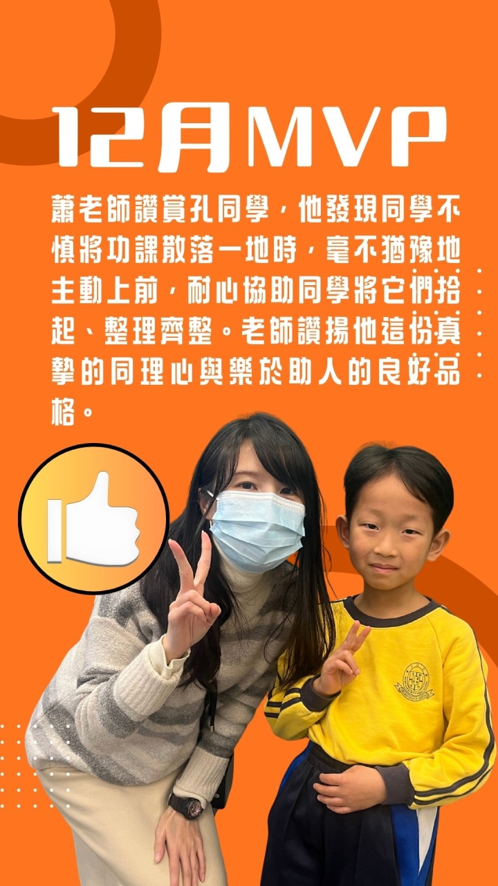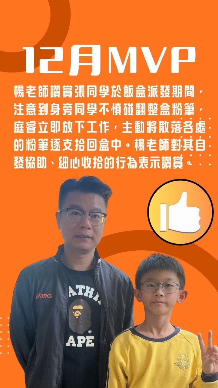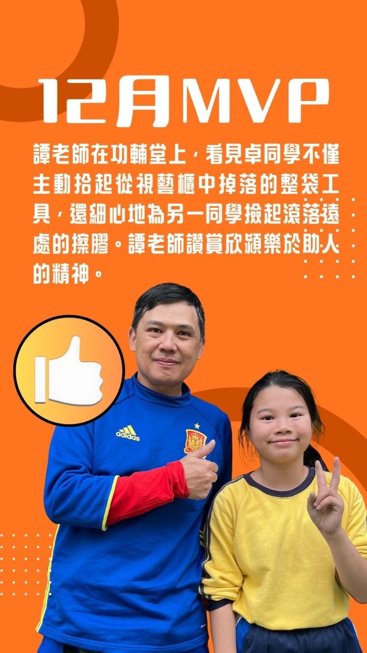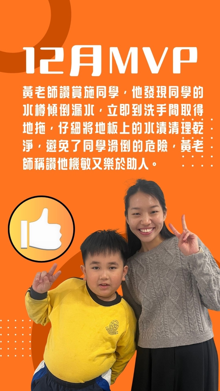 這些貼心又細心的小行動,令班房和走廊都充滿暖笠笠的力量,也正是12月MVP最耀眼的地方:懂得留意身邊需要,勇於伸出援手,樂於為別人付出。期待下個月會有更多小小MVP出現,一齊把「樂於助人」的精神發揚光大!